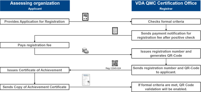 After checking the formal criteria and payment of the registration fee the Automotive SPICE office will send a QR-Code and registration number enabling the applicant to issue the certificate. As a last step the online validation process will be enabled, if the certificate complies to the given requirements.